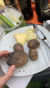 Mit viel Erfahrung und Fingerspitzengefühl werden die Buchenholzscheite aufgeschichtet und abgebrannt, bis sich eine perfekte Glut bildet – die Bühne für die Kartoffeln, die darin rund eine Stunde garen. Das Ergebnis: außen heiß, manchmal etwas knusprig, innen herrlich weich und aromatisch. Für viele Dalhauser sind diese Glutkartoffeln eine echte Spezialität – besonders in Begleitung von Schmierwurst, Kräuterbutter, Salz und, je nach Geschmack, einem kühlen Bierchen oder einem herzhaften Schnäpschen 😊. Herzlich und bodenständig – echtes Heimatgefühl.